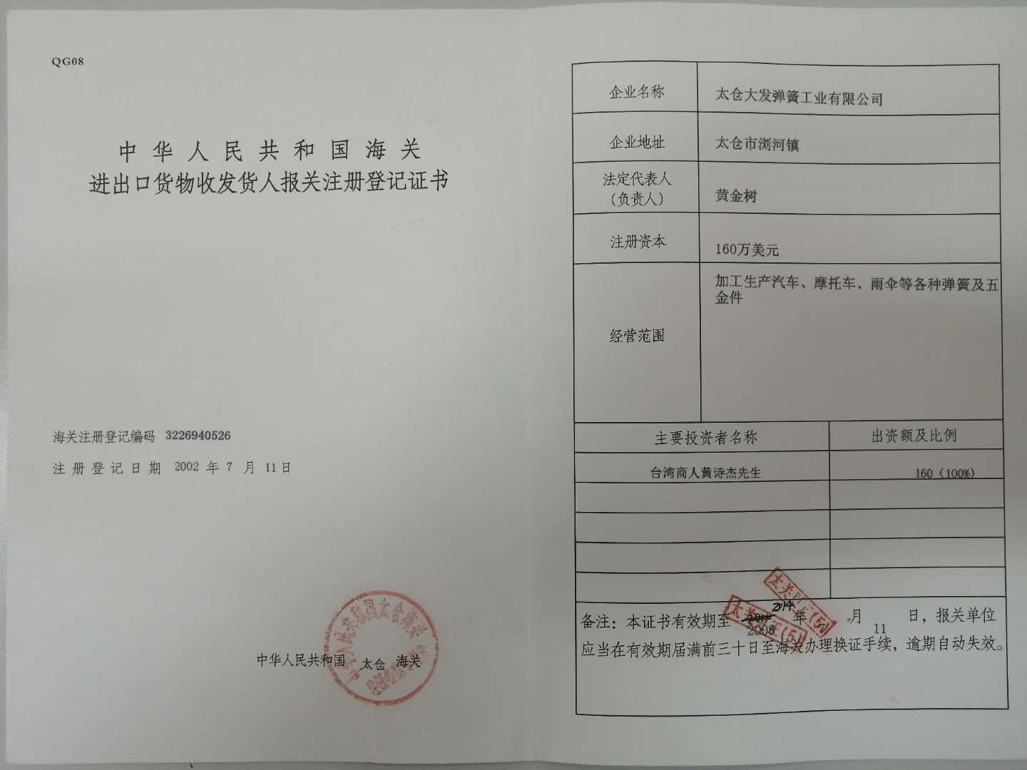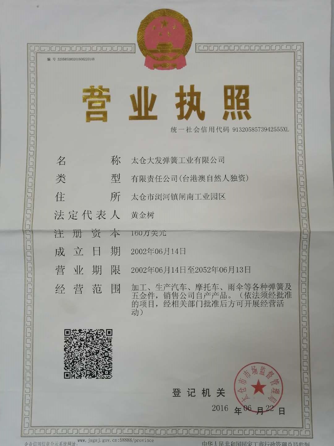 太倉大發(fā)彈簧工業有限公司由黃金樹先生于1967年始創于臺灣,是一個集雨傘、電子、五金機械、自行車、摩托車、汽車等的彈簧配件生產、加工、輔助設計服務的綜合性企業,其中1990年創辦的廈門大發(fā)彈簧公司、2000年創辦的深圳大發(fā)彈簧公司、2002年創辦的太倉大發(fā)彈簧公司均位于經濟發(fā)展地區,地理位置佳。我們憑借在彈簧制造業的多年豐富知識與技術,并著眼于以客戶為導向,秉持“以人為本,以質為先,以客為主,持續創新”的經營理念,強化競爭優(yōu)勢。公司導入ISO9001: 2000質量管理體系,執(zhí)行ISO14000:2000管理方式,倡導安全、高質量、高素質的生產。
